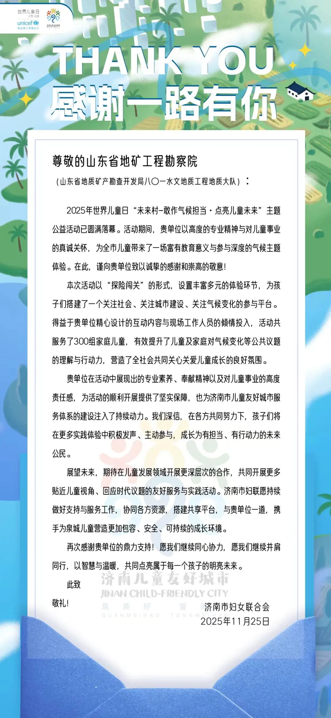 活动结束后,济南市妇女联合会向山东省地矿工程勘察院发来感谢信,信中特别赞扬了山东省地矿工程勘察院“展现出的专业素养、奉献精神以及对儿童事业的高度责任感”,并指出山东省地矿工程勘察院的参与为儿童友好城市建设注入了具有地方特色的实践动力。